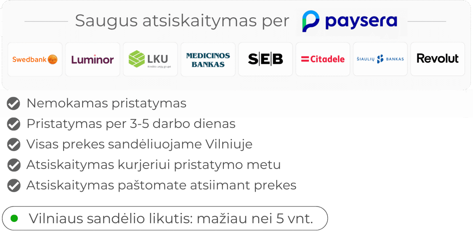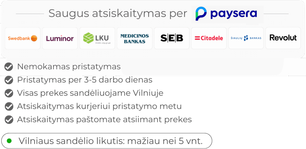Nemokamas pristatymas per 3-5 darbo dienas visoje Lietuvoje (DPD, Omniva, LP express).